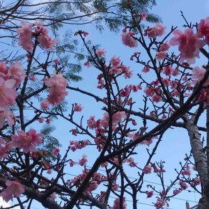 カンヒザクラ 職場の庭にて 少しずつ 咲きだしました🎶 青い空に桜色が鮮やかです🌸🌸🌸