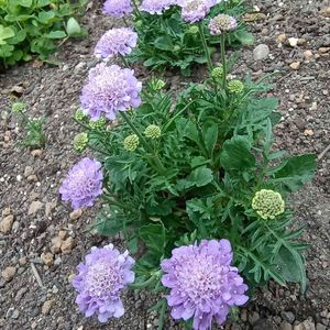 5/2に鉢植えから地植えにした スカビオサブルーバルーン💜 あの蕾が開いてきています🎶 キレイな花色に癒やされます💗 左端の小さなブルーバルーン見えますか? 地植えするときに、 一株を 2つに分けて植えたのですが ポロリととれた小さな🌿も 隣に植えつけました ちっちゃな蕾に「ガンバレ🎶」 と応援📣しています🤭😉