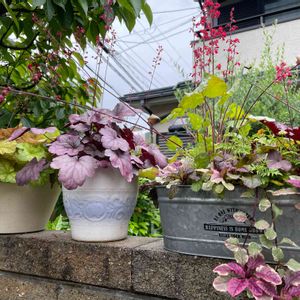 おはようございます♡ 塀の上のヒューケラさんたち(⁎˃ᴗ˂⁎)! アジュガもいい感じ♬⋆* カラーリーフ大好き♡