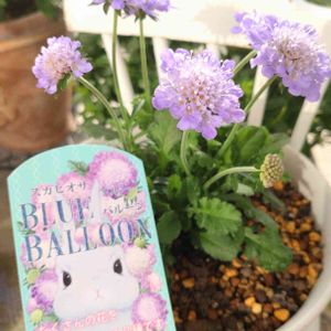 スカビオサブルーバルーン、お迎えしました🥰 ネームタグも可愛い🐰💕ので一緒にパチリ📸