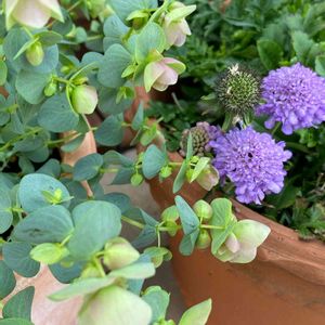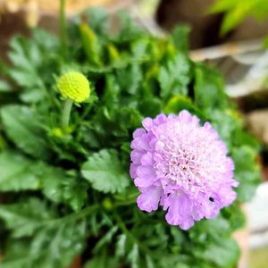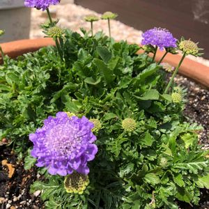 寄せ植えの中のスカビオサ💜 長い間 休眠してたけど咲き始めました🎶 和名マツムシソウって言うらしいですね 可愛いお花です💜🌿