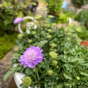 4/14に投稿したスカビオサ ブルーバルーン❣️ 一番大きな蕾が開きました🍀 株分けして二株になって 蕾がたくさんついて楽しみです🎶😀