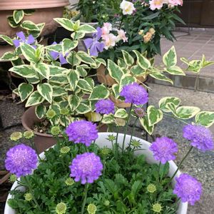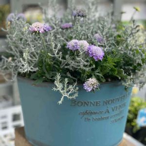 スカビオサ ブルーバルーン 冬の間はお花が無かったのですが、また咲いてくれました✨ 11月にビオラと植えた寄せ植えをリメイク お花小さめかな、いつまで咲くのか楽しみです💕