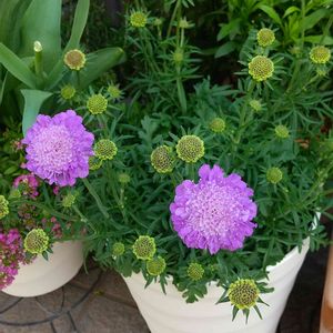 いくつも花をあげてくれるスカビオサブルーバルーンとアルメリア スッと伸びてポンポンと咲く姿がとても可愛い 乾かし気味に育てる植物が苦手なんですが 順調で安心