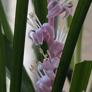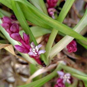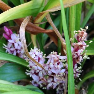 キチジョウソウ 庭の奥の片隅で、ヤブランに似た葉の間から今年も花を覗かせているのは5株🩷 栄養が足りないのか、実をつける両性花は少なくて、ほとんどが雄花のようだ🔴 雄しべ6個、数少ない両性花の中で、撮せた雌しべの柱頭は、3つに分かれている△ 当然、チームうずくまり🏷になって撮すのだが、この時期はヤブ蚊もいないので、少し楽(^_-) 地面につけたヒザのあたりは、湿った土で汚れてしまうが… 短い花茎に蕾をつけて、下から咲きあがっていく金曜日の蕾たち🏷
