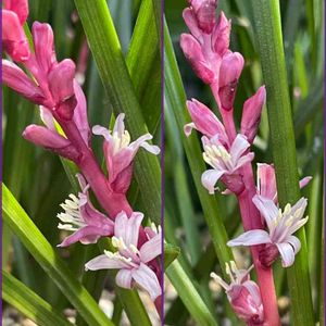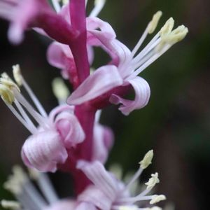 キチジョウソウ💕(吉祥草) アップです(*^-^*) 下から3輪までは、両性花なので 雄しべと雌しべがあります。 見辛くてわかりにくいですが 雌しべが分かりますか? 他の上の方の花は、 雄しべだけの雄花です。