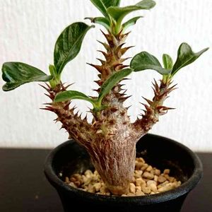 私がコーデックスの栽培を始めるきっかけとなったグラキリス。 県外の園芸店に行った際、多肉植物エリアで販売されていました。パキポディウムは、本でしか見たことがなく、実際に手にとって近くで眺めてみると『いいなぁ…。』と思いました。 当時は今より全然価格も高騰していて…しかも現地球の為、未発根の状態。 迷いましたが、その日は諦めて帰宅。 でも翌日、やっぱり気になって、園芸店に電話をして、無理をお願いして配送して貰いました。 家に届いた時には『また会えたね。』と嬉しくなりました。 ファースト コーデックスです。 ボディーの模様が変わっていて、そこがお気に入り。 発根がなかなか進まなくて、去年までは、葉を一切つけていなかったのに、今年は枝2本から葉を出しました。あと1本…。 ご機嫌が良さそうなので、植え替えをしました。