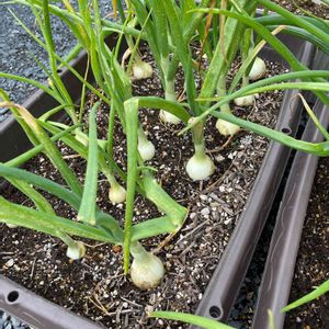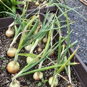玉ねぎそろそろ収穫😃 朝に4つ、採ってスライスして食べました!美味しかった~! 小玉~Mサイズくらいの出来😊 また秋に種子蒔いて、育てようと思います♪😆
