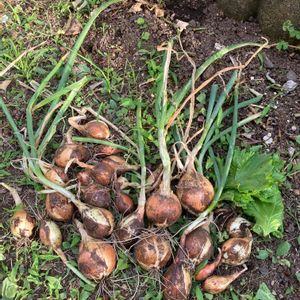'赤玉サラダ'収穫 昨年11月に植え付けた玉ねぎ達。引き伸ばしていた収穫を一部実施。期待半分だったが、やはりペコロスのような可愛い玉ねぎが...美味なのと調理のし易さが何より。梅雨入り後の収穫で、痛んで無くて良かった!