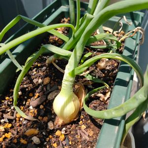 【ペコロス(小タマネギ)】 枯れはしないけどあまり変化がないなぁと放置気味にしていたら、ちゃんと下の方が玉ねぎらしくなってきました🧅5月中には収穫予定😊