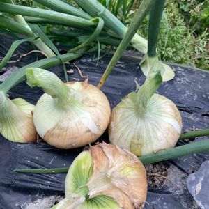 【種からの玉ねぎ(早生)】 葉が倒れてきた分だけ、お天気が荒れる前に収穫😊葉が倒れても緑のうちは肥大するけど、日持ちが悪くなる。 早生とはいえ、今年は早いなぁ🎵