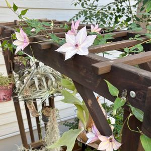 秋なのにクレマチスが満開になっていてとても幸せな気分。 夏に葉が傷みすぎて、全部根元で切っちゃったから、一旦リセットして元気になったのかな? 1枚目はリビング&ウッドデッキ側から、2枚目は家の正面&庭から。 外から見えるのは2枚目なのに、そちら側のお花が少ないのは、見てもらえなくてちょっと残念。