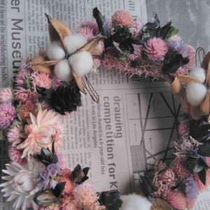 ピンクの千日紅を中心に、コットン、麦藁草などを飾りました。