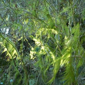 これは?? サルオガセ? キヨスミイトゴケ? 裏木曽 標高600m 渓流沿いの林道脇 法面には吹付け工の金網が写っています。黄色く明るい部分は日の当たっている箇所です