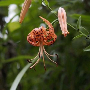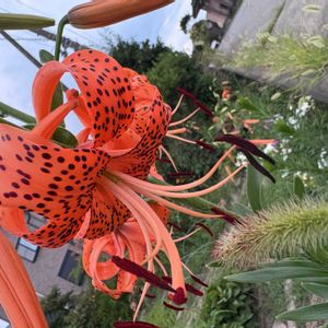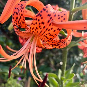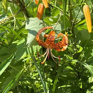 オニユリ(鬼百合)が咲いていました。 花びらは6枚で、オレンジ色💛で茶褐色の斑点が特徴です✨ 反り返り下向きに咲くので、これものぞき込む形で📷✨🌟 葉の付け根にムカゴがあります🎶😃