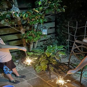 こんにちは😊 最高に暑い🥵です。 🏷️毎月2日はスヌーピーの日に参加します。 ①でっかいホスタと線香花火🎇 ②ずっと何年も花芽は1個でした。去年はじめて2個になり、今年は4個出てきました。嬉しいな😃 善はるちゃん。のスヌーピーリメ缶は、小人の花束です。