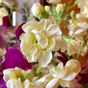 昨日デイサービスの職員さんが来たときに玄関のお花が綺麗ですね✨と言われたのでよく見ると八重咲きのストックが満開になってました