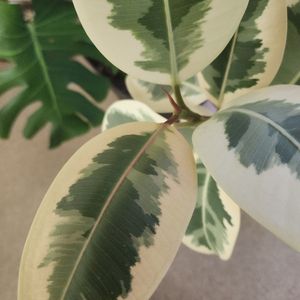 🤍フィカス ・ティネケ 💚 毎月お世話になっている友達の整体院✨の窓辺にづら〜と観葉植物🪴さんが並んでいます♪̊̈♪̆̈ その中でも迷彩柄が素敵なフィカスさん⭐🎵 🏷8日は葉っぱの発表会に参加させて頂きます🍀*゜