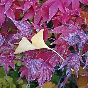 四角く刈り込まれた紅いブッシュの上に、銀杏の葉が散っていて、アートを感じました (11/23)