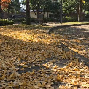 黄葉した葉っぱが下に落ちて綺麗な絨毯になっています。 上を観ても下を観ても綺麗です(ᵔᴥᵔ) 平日の公園なので、ほとんど人が居なくてのんびり気分😊