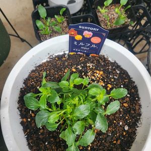 おはようございます😊 去年の春に自分で種取りして管理して種まきしたサントリーフラワーズさんのミルフルが開花しました(୨୧ ❛ᴗ❛)✧🌼*・♡ 1から自分で育てた花が咲くと一段と可愛い(*´˘`*)♡ 今年もやろうかな〜🤭 泥はねで鉢が汚くてすみません💦💦