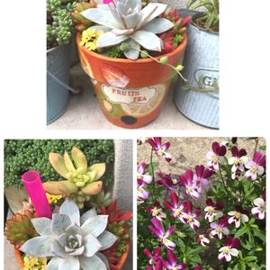 おはようございます♪ mokoさんの鉢 ☆フルーツティ鉢☆に寄せ植え💕 イメージに合わせて このようになりました🎵 氷、フルーツが入ってるような感じ〜😅 右下のウサギちゃんのビオラ 切り戻しした後に復活したもの💕 また盛り盛り🎵 最近買ったリメ鉢やリメ缶 少しずつ寄せ植えしなくちゃ❣️