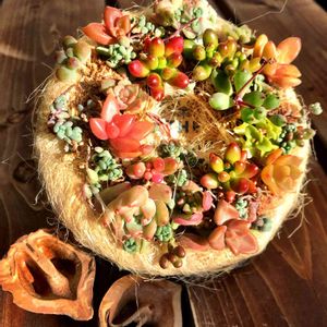 秋の日差しを受けたくるみ*さんの茶こしリースです✨✨ ワークショップで作成して4週間、多肉さん達が、プリプリ紅葉で一層可愛くなりました🎶