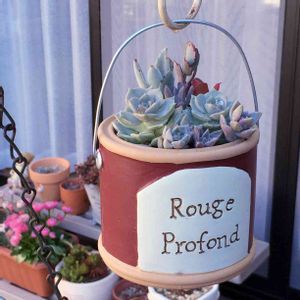 鉢を挟んで吊るすフック。本来は蘭用に販売されていますが、ベランダが狭いので、吊るせるものは吊るすスタンスで、盆栽鉢を吊るしています。 はさむだけですが、なかなかのしっかり者。でも、今夜は台風なので避難しています。