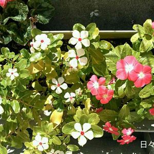 ニチニチソウ(日日草) 赤、白、ピンク 駐輪場の花壇に咲いていました。