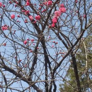今年も我が家の紅梅がちらほら咲き始めました。😃❤️ 青空に映えてます。👍😊