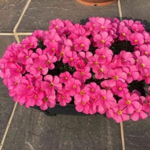 ほぼ満開のオキザリス 桃の輝きです。 朝日のあたる一等地で咲き誇っています。 エアコンの室外機の上ですけどね😅