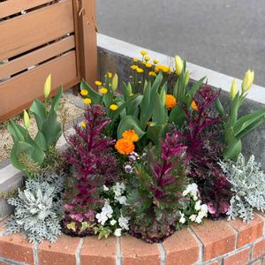 我が家のミニ花壇✨ チューリップがやっと咲きそう💕 葉ボタン光子(みつこ)、ぐんぐん伸びてる😄