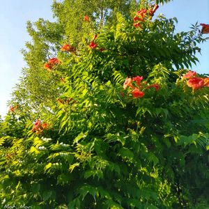 こんにちは〜😊 いつもの朝さんぽ🚶♀️🚶♀️🚶♀️ コミュニティガーデンで ノウゼンカズラの赤い花が咲いていました🌺 2025.6.20 📷️