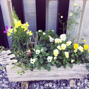 玄関先でお客様をお迎えする淡いイエローを中心とした寄せ植えです