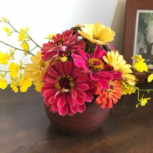 隣の畑のおばさまが、育てているお花を摘んでくれました♡ フォトコンテストの賞品でいただいたオンシジュームを一緒に。 手作り&プレゼントの温かいおもてなしのお花になりました。