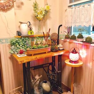 ボロボロになってしまった足踏みミシン。思い切って、上の部分を取り除き、板を乗せてみた^ ^