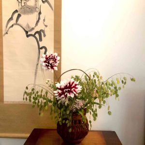 秋色の庭でダリアが生き生きしています。 アメリカの骨董オークションで見つけた日本製の竹籠に入れました。 花材: ダリア、コバンソウ、ライスフラワー、小菊