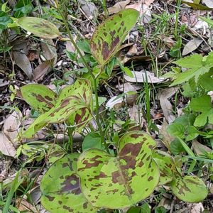この変わった模様の葉を持つこのコは、誰でしょうか🙄? 陽の当たらない雑木林に生えてました。 追記) ★サルトリイバラ(猿捕茨)★ サルトリイバラ科の落葉つる性低木 花期:4~5月 茎は緑色で硬く、地面から直立し、節ごとに曲がり、まばらに刺があり、巻きひげにより周囲の樹木などにからみつく。葉は互生、長さ3~12㎝の円形~楕円形で3脈が目立ち、光沢がある。葉の先は少し尖り、基部は心形で、全縁。雌雄異株。花は散形花序に多数つき、黄緑色。 Quote https://mikawanoyasou.org/data/sarutoriibara.htm 2025.GW 七生丘陵📱