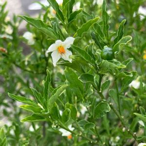 低い木に、1センチぐらいの小さな花 タマサンゴ?イヌホオズキ? 葉の感じではタマサンゴかな… タマサンゴなら赤い実、イヌホオヅキなら黒い実がなるようなので、正解は気長に待ちます😄 (7月4日に🏷付けました)