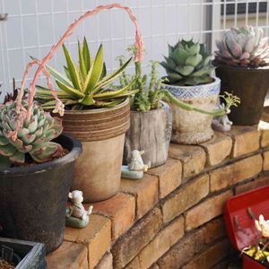 レンガの上は多肉植物たちの席。 幅があまりないので、小さめの鉢しかのせられないけど、 かわいい鉢や、コップにドリルで底穴を開けて多肉植物を入れてます🥰 陶器は重さがあるからか、案外落ちずに飾れています(๑•̀ㅂ•́)و✧