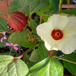 先日ローゼルの実を収穫?しました~✌️ その実をやっとジャムにしました~👌 リンゴとハチミツと少しきび砂糖をブラスしてやっと瓶の半分にも満たない😢 でも近々の私のやすみの朝御飯にパンに乗せて戴きたいと思います🎵 収穫した後にも花が咲いて、残した実も膨らんでいます🎵 種はとりましたがまだまだとれるかな✨