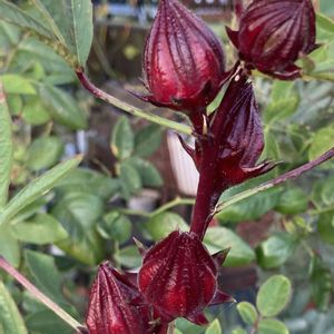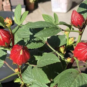 薫乃さんから頂いたローゼルの苗 今年初めてローゼル育ててみました ローゼルは日光を好むようで軒下の日向に置いてあったのですが花が咲きませんでした😅 まだまだ日光不足だったのでしょうか💦 この赤いガクはジャムやティー、塩漬けなどで食する事が出来るみたいです☕️ どうしようかな〜(๑>◡<๑)