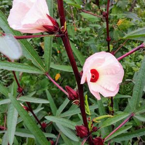 赤花 ローゼルちゃんです。 なかなか 咲かなくて 待っていました。 次々と、咲きそうです。 ジャムが、出来るくらい咲いてくれるかな?