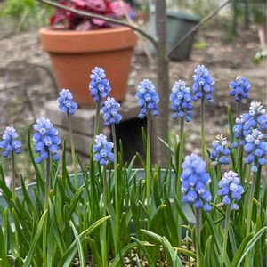 鉢植えのムスカリ 紫ではなく水色、これは植えっぱなしでも葉がびろーんと伸びないんです。 多分マウントフットを種から増やして、この鉢に植え替えてから5〜6経っているかも? 中心には、八重のドクダミを植えてあるけど一度も咲いた事がない。 後ろの鉢植えヒューケラも殆ど咲かない。 育て方に問題あり(^◇^;) 真ん中に突っ立っている木は、大のお気に入りのフランクリニア♡