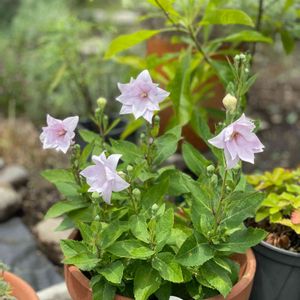八重の桔梗のその後 開花が進んでおります。 後ろのフランクリニアも順調に育っています。 花咲く気配は今の所全くありません。