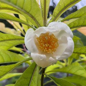 フランクリニア(アメリカシャラ)の紅葉が始まっています …フランクリンアラタマハ 純白の、ゆで卵を割ったようなシベの黄色いお花も、優し気な立ち姿も、そしてこの和らかい紅葉も…全て大好きです!!