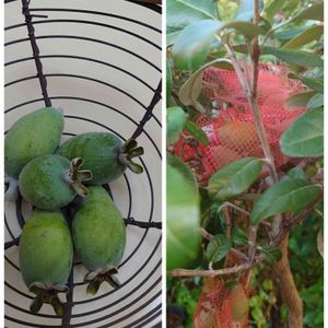 フェイジョア 落下防止ネットをかけようとしたら落ちて来た実〜💚 どうしたらいいんかな???とりあえず柔らかくなるまで待ってみようか?🤔