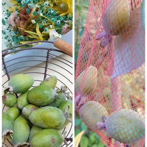 フェイジョア 遂にネットにポトポト落ちて収穫祭💚💚💚 柔らかくなったのを食べてみたら、案外いける〜🍐のような食感と甘味〜種は気にならない💚👍 少しずつ友達にもお裾分け✨
