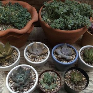 一昨日に植え替えした子達♡ (上段)ミロッティ*ティッピー*ピーチネックレス (下段)ラウリンゼ*レズリー*切り離した七福神のお子様 & またまた塗り塗りしたリメ鉢♥︎︎∗︎*゚ 大きい方はザラザラバージョン作ってみました୧(ᕯ˙ᗨ˙ᕯ)୨ ★ティッピ-・ラウリンゼ→8/1友人が送ってくれた子 ★ミロッティ・ピ-チネックレス・レズリ-→HC