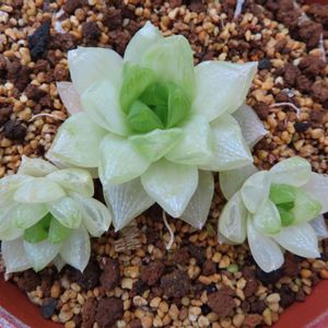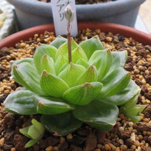 時々、GSで見事に群生した姿を見かけるハオルチアのメアリ。少し前に植え替えた時に5個あった子株のうち3個が外れて、群生から少し遠ざかってしまった。 それでも、葉の柔らかい緑の色合いや少し花芽の伸びた姿に見入ってしまう。